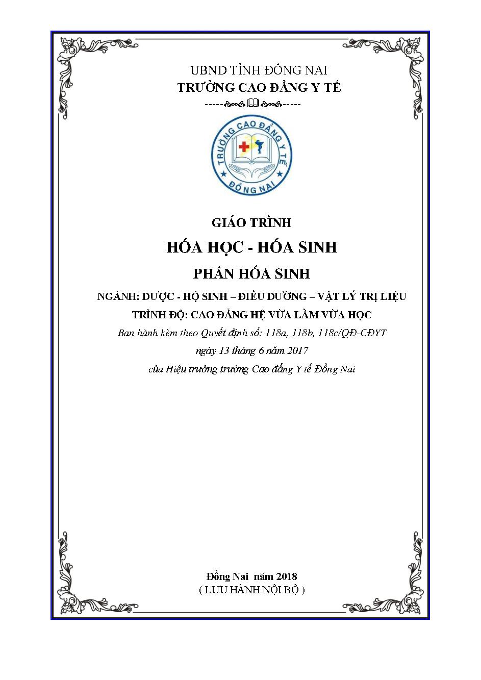 Giáo trình hóa học - hóa sinh : Ngành Dược - Hộ sinh - Điều dưỡng - Vật lý trị liệu, Phần hóa sinh / Nguyễn Trần Tuấn Kiệt chủ biên